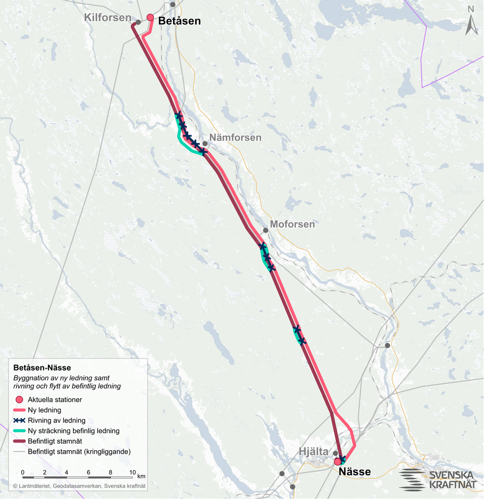 Den nya luftledningen blir cirka 47 kilometer lång och byggs för 400 kilovolt (kV) mellan stamnätsstationerna Betåsen och Hjälta i Sollefteå kommun. Från Hjälta dras ledningen vidare till den nya stamnätsstationen Nässe, som driftsattes i november 2025. Stationen möjliggör anslutning av mer än 500 megawatt vindkraftsproduktion till stamnätet.